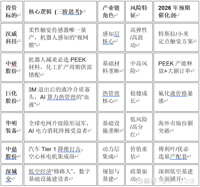 一阶思考(显性共识):基于直观的因果关系。例如,人形机器人爆发 -> 买入机器人本体制造商(优必选、特斯拉)或总成商。这层逻辑的缺点是竞争格局未定,且当前估值极高,容易遭受量产推迟的戴维斯双杀 2。