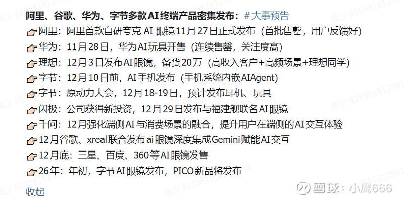 阿里、谷歌、华为、字节多款AI终端产品密集发布:#大事预告今阿里:阿里首款自研夸克 AI 眼镜11月27日正式发布(首批售罄,用户反馈好)今华为:11月28日,华为AI玩具开售(连续售,关注度高)女理想:12月3日发布AI眼镜,备货20万(高收入客户+高频场景+理想同学)今字节:12月10日前,AI手机发布(手机系统内嵌AIAgent)今字节:原动力大会,12月18-19日,预计发布耳机、玩具