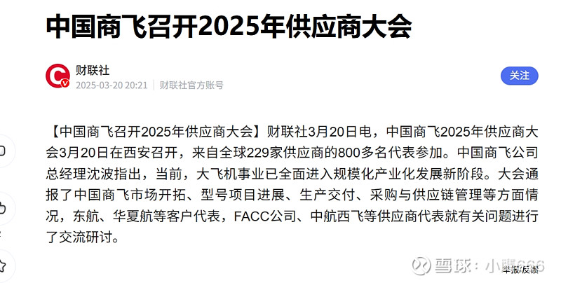 过去几年的商飞大飞机供应商大会都是3月下旬举行,25年已经点名航空发动机早日装机,让大飞机装上中国心,今年攻坚大年,装机成功将彻底破解国产大飞机量产瓶颈!