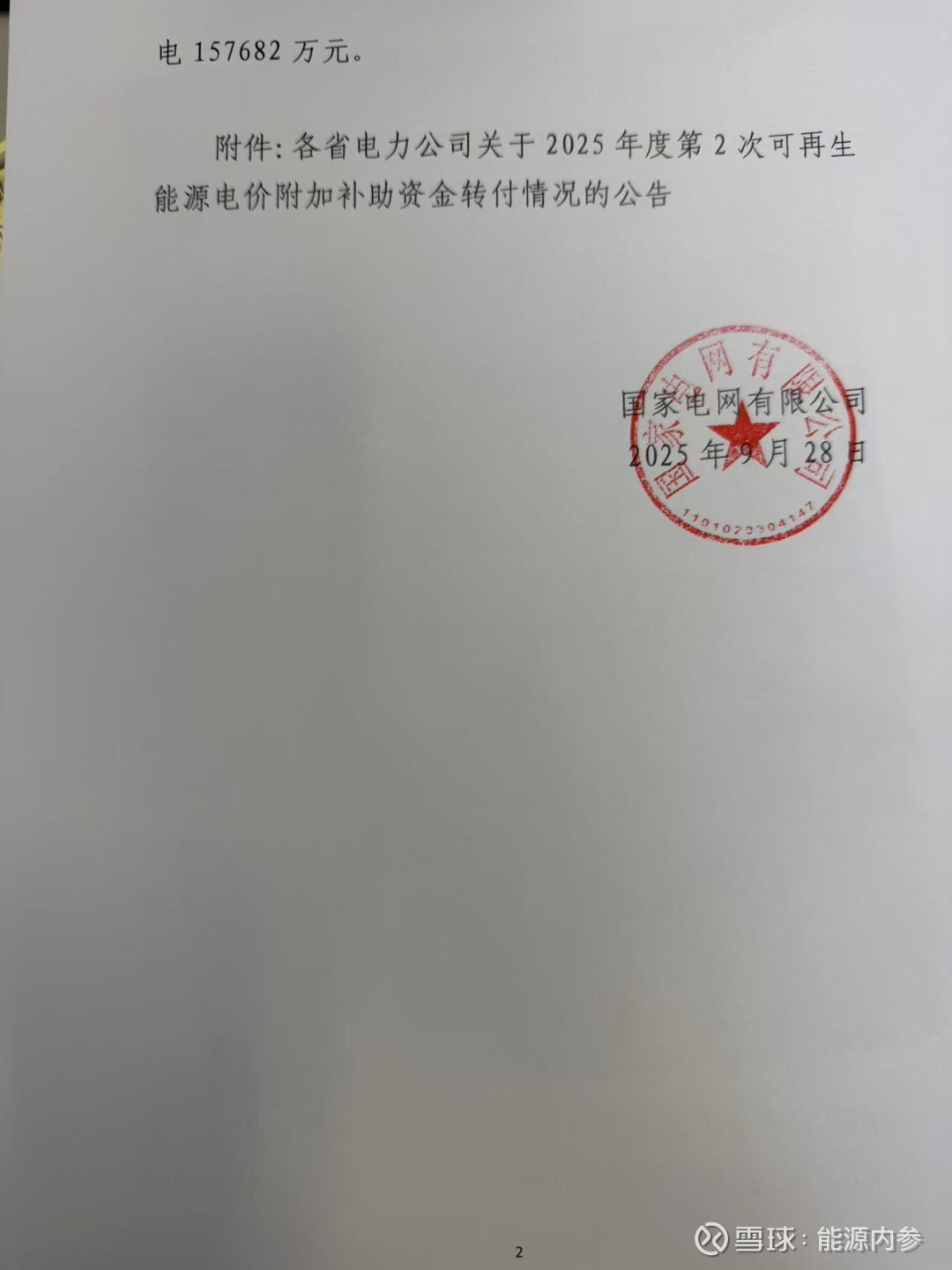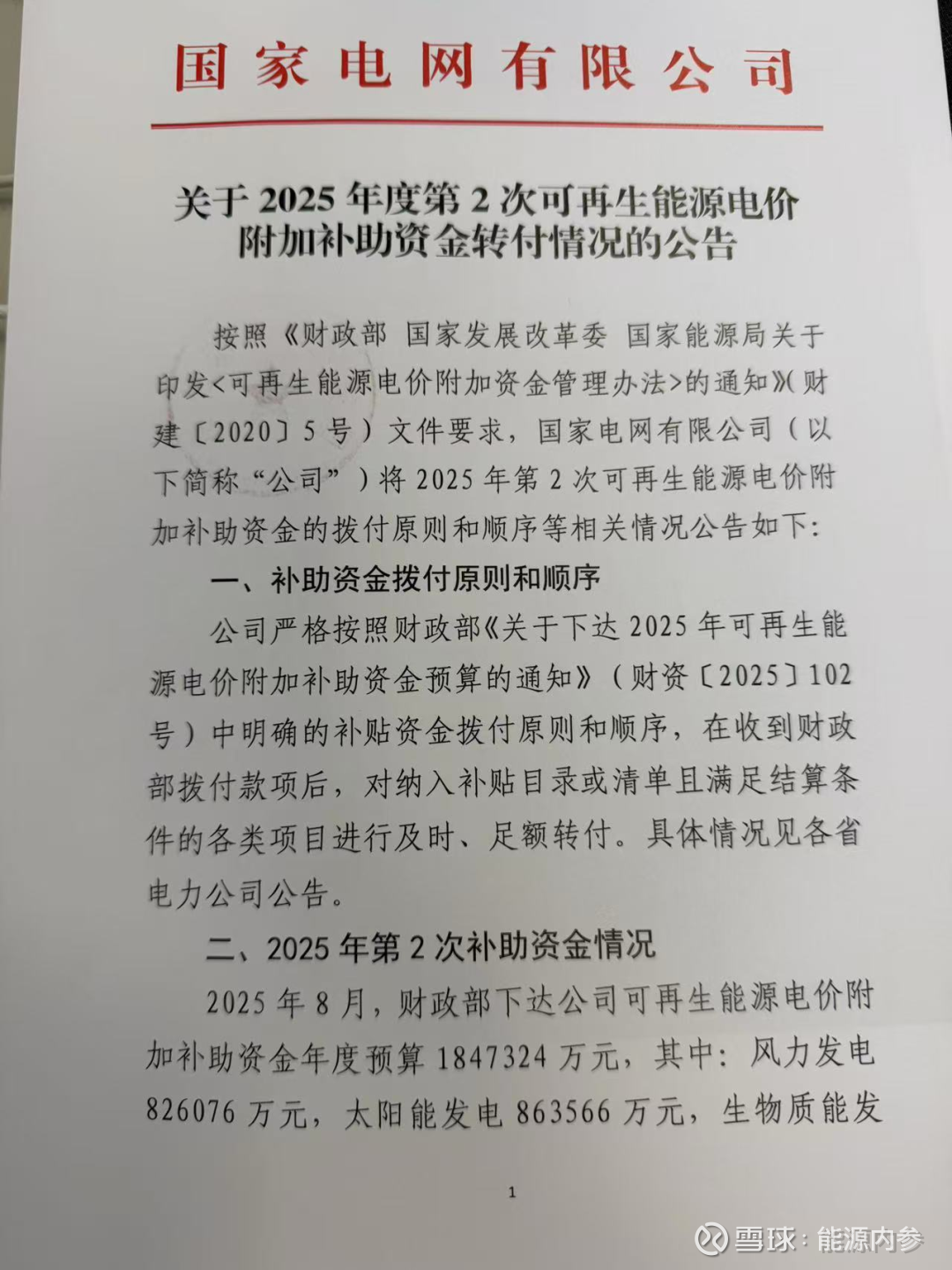 根据公告,2025年9月,财政部下达公司可再生能源电价附加补助资金年度预算923662万元,其中:风力发电413038万元,太阳能发电431783万元,生物质能发电78841万元。