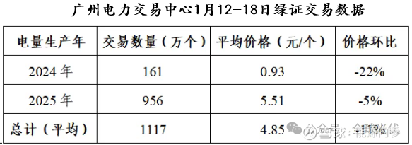 根据广州电力交易中心提供的数据,2026年1月12日-1月18日,广州电力交易中心平台绿证交易1117.28万个,较上周环比增加21%;交易均价4.85元/个,较上周环比降低11%。2026年累计交易量2042.38万个,交易均价5.11元/个。