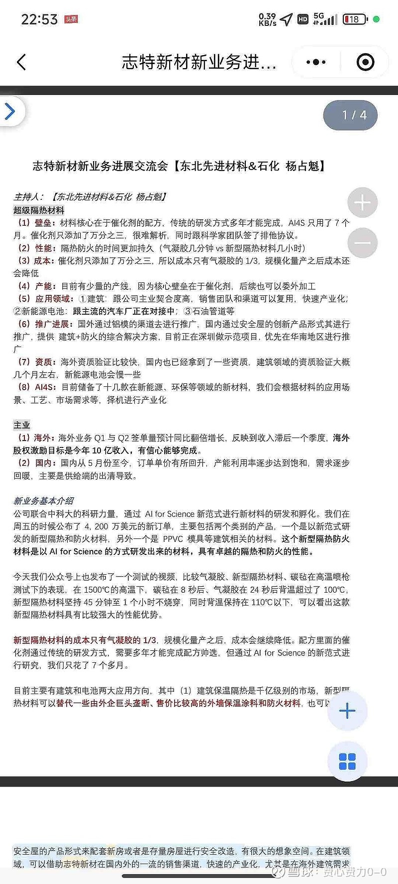 2025年5月17:公众号发布 AI for Science产业化成果:超级隔热材料,依托主业国内外渠道快速产业化, 志特新材携手中科大实验室构建联合研发平台,并于近期成立“志特小临智能科技有限公司”,布局新材料研发与产业落地。公司近期将首先启动超级隔热材料产业化落地,相关材料核心壁垒在于催化剂的创新,通过“AI+机器人”结合的方式仅用数月就完成了催化剂材料及配方的筛选,大幅降低材料熔点和反应温度,性能相比气凝胶提升2倍以上,而成本仅为其1/3左右。超级隔热材料以涂料、片材等形式应用,在建筑隔热(阻燃)涂料、电池防爆等领域有望持续替代隔热保温涂料、气凝胶等传统方案。同时,志特新材将充分利用国内外客户资源,依托主业一流的海外销售渠道,推动该“AI for Science超级建筑材料”产业化落地,并打造“安全屋”等基于相关新型材料的创新建筑方案。