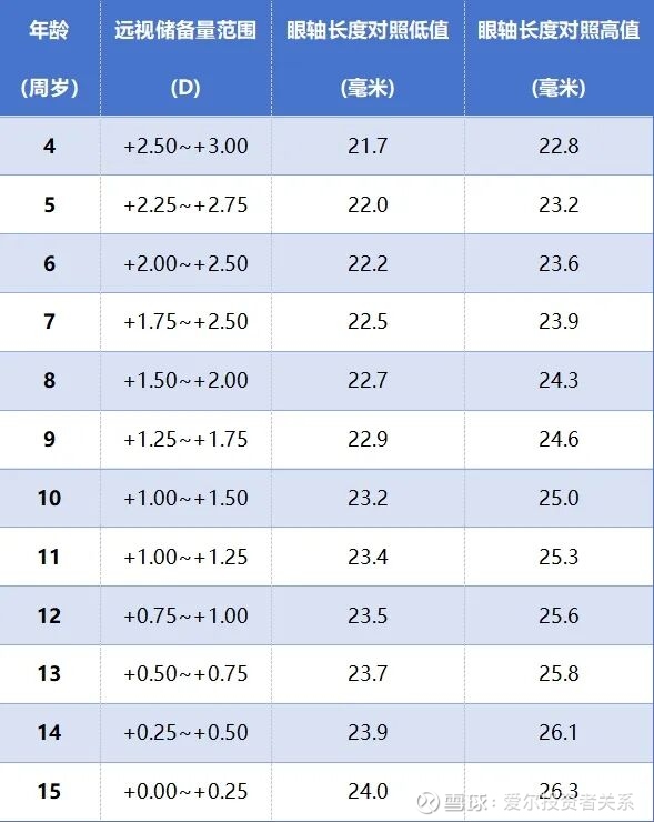 更为关键的是,这种消耗是渐进且隐匿的。根据全国综合防控儿童青少年近视宣讲团开展的儿童青少年近视发生发展不同阶段防控指引研究,不同年龄段有着对应的正常远视储备范围(详见下图),当孩子的储备值低于同龄人正常范围的下限时,就亮起了近视的“预警红灯”。