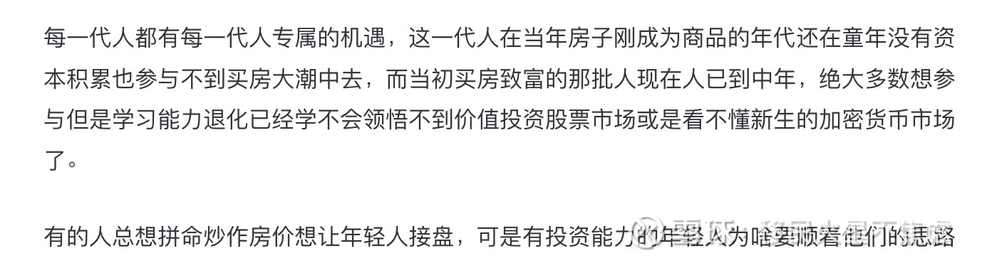 每个时代都有每个时代的机遇,黄金年代已经过去,还是需要继续向前看。之前2021年5月写过一篇文章说房子不是年轻人的机遇,资本市场才是,年轻人要建立自己的投资能力。有点我觉得我写得还是很好:每一代人有每一代人的机遇,新一代人当然没法重复老一代人的经历刻舟求剑,但新一代人也有属于自己时代的机遇,只有拥抱新的时代才能抓住新的机遇。