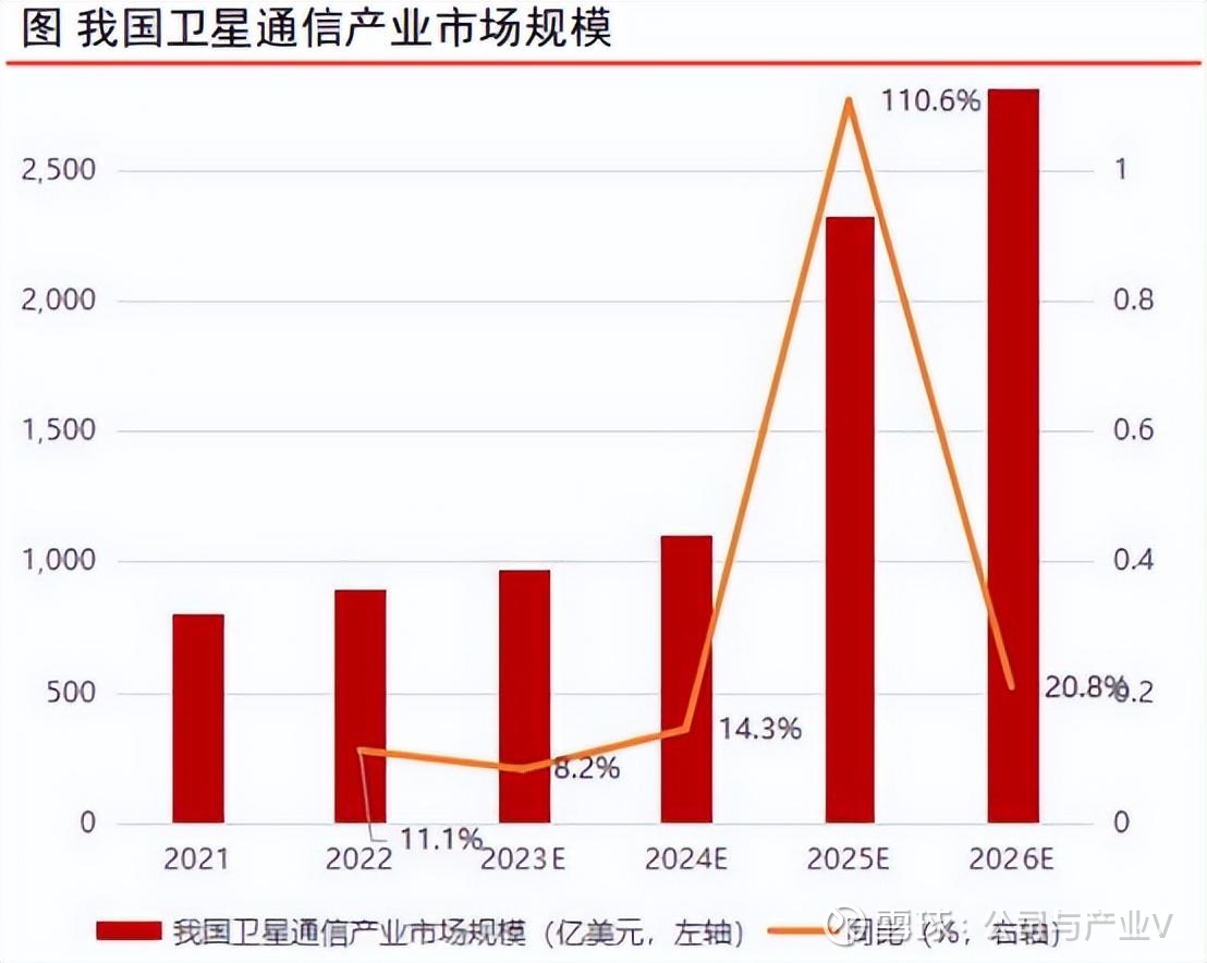 SIA预测,2022年我国卫星通信产业市场达894 亿元,2026年市场规模有望突破2700亿元,2022-2026年复合增速超30%。