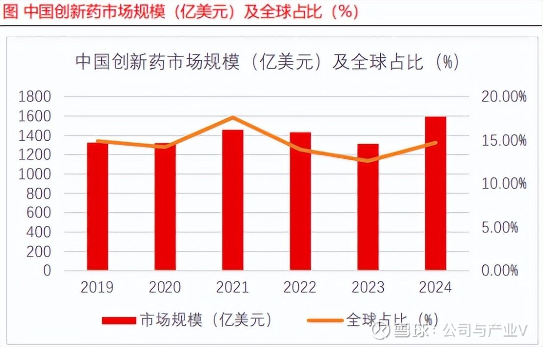 据相关统计及预测,2024年我国创新药市场规模达到1592亿美元,占全球比例仅有15%左右。