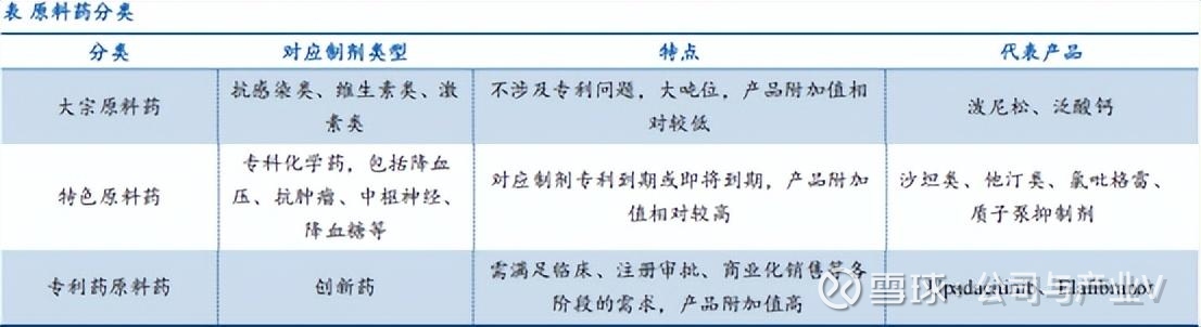 生产药品制剂的主要原材料为原料药,同时按专利价值不同主要分为3类,大宗原料药、特色原料药和专利原料药。