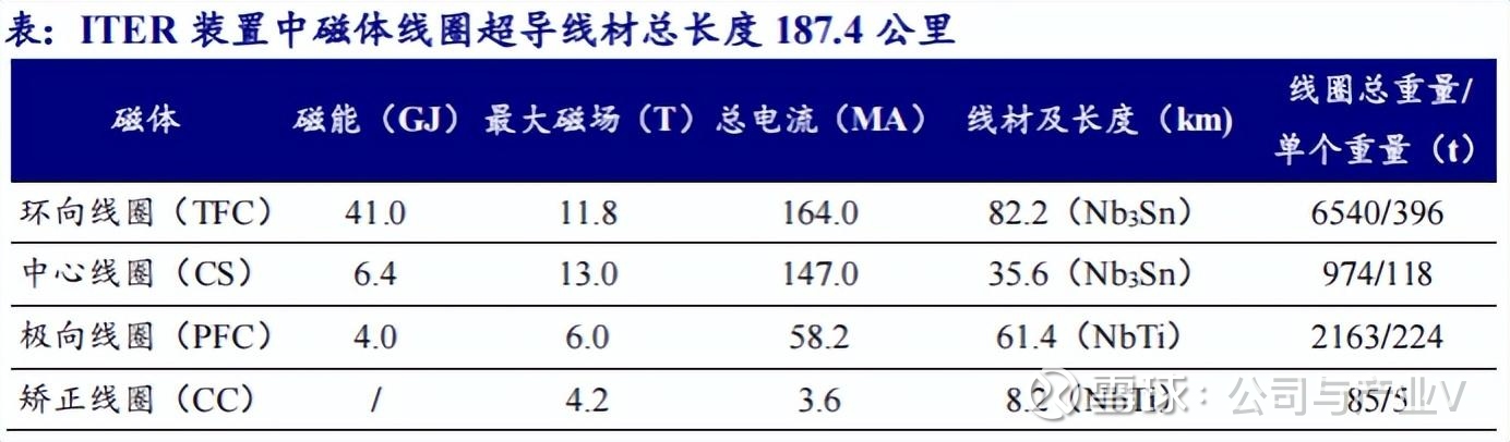 以ITER(国际热核聚变实验反应堆)磁体系统为例,四个主要子系统的超导线材总长度达到了187.4km,总重量近万吨。
