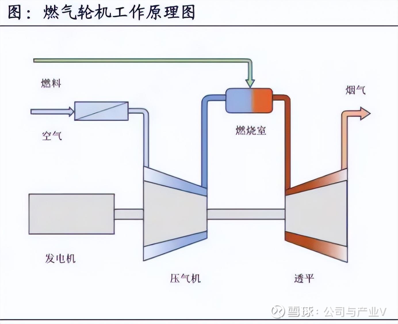 从燃气燃烧过程来看,空气从入口进入压气机,压气机利用前排叶片把进入的空气压缩为高压空气,为后续燃料燃烧助燃。