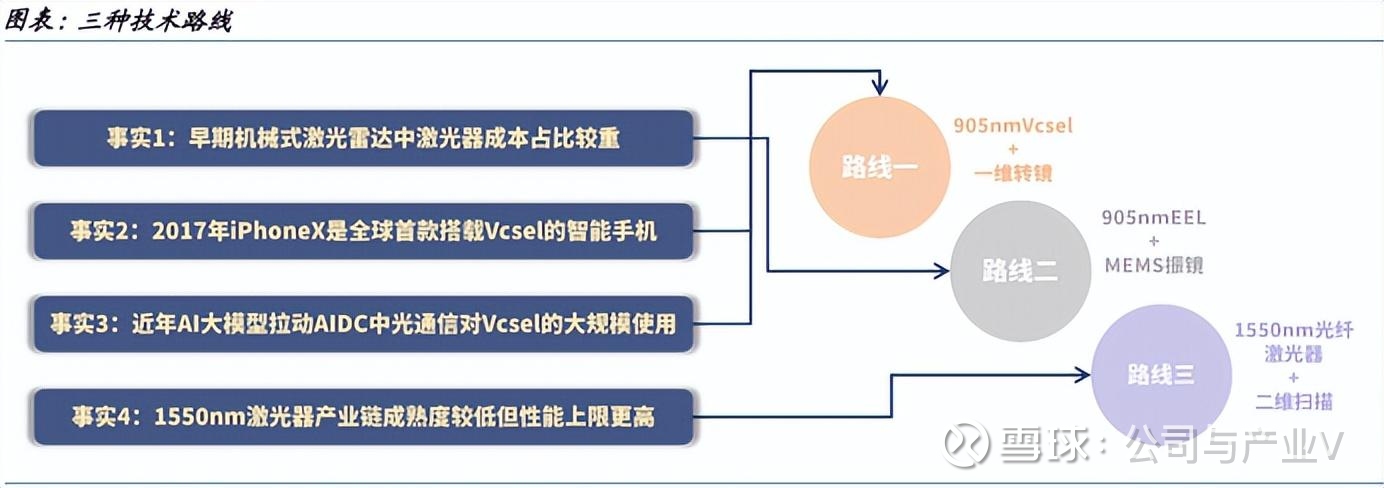 当前国内外主流激光雷达厂商围绕905nm和1550nm两种波长形成了三条代表性技术路线。