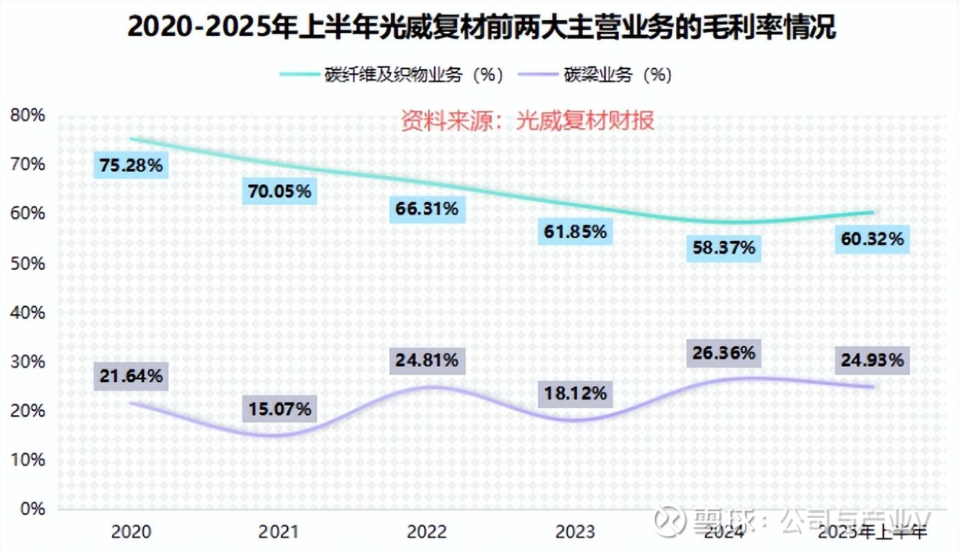结果就是,光威复材碳纤维及织物业务的毛利率从2021年的70%以上,逐渐回落到了2025年上半年的60%。
