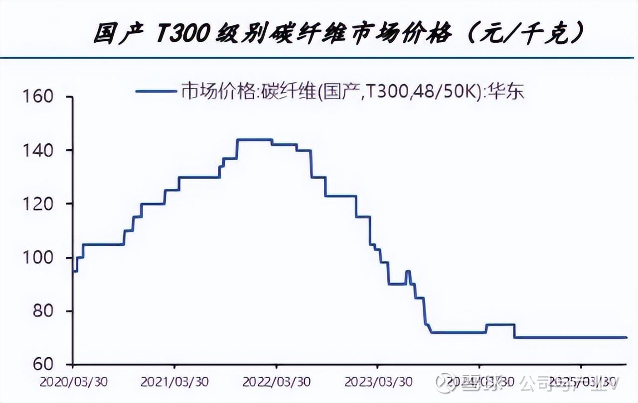 直接看数据。一边是大丝束、小丝束碳纤维的价格较2022年的高点双双腰斩,截至2026年3月4日,国产T300级别48/50K的价格已经低至65-75元/千克。