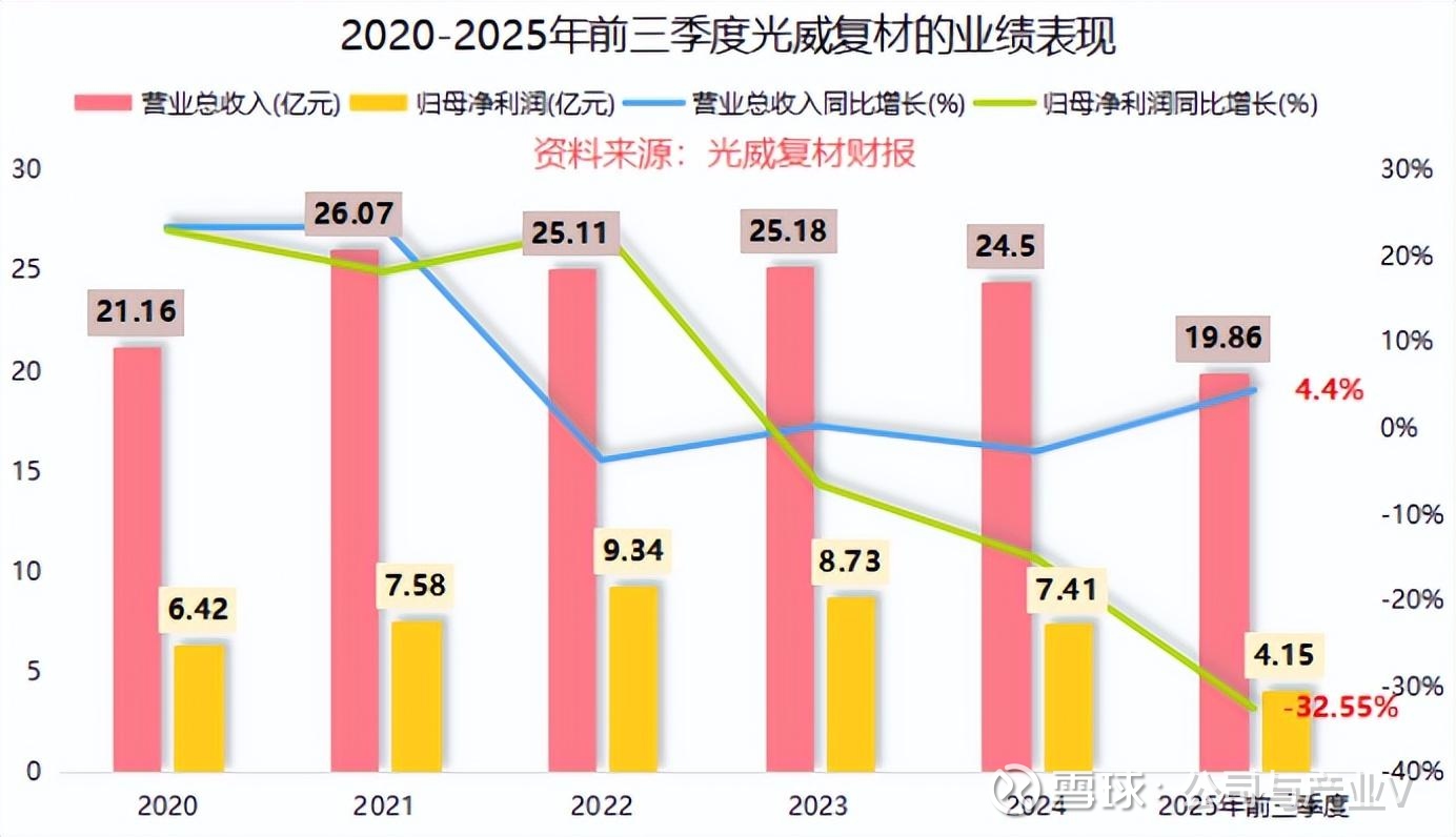 2025年前三季度,光威复材实现营收19.86亿元,同比增加4.4%;实现净利润4.15亿元,同比下降了32.55%,陷入典型的增收不增利。