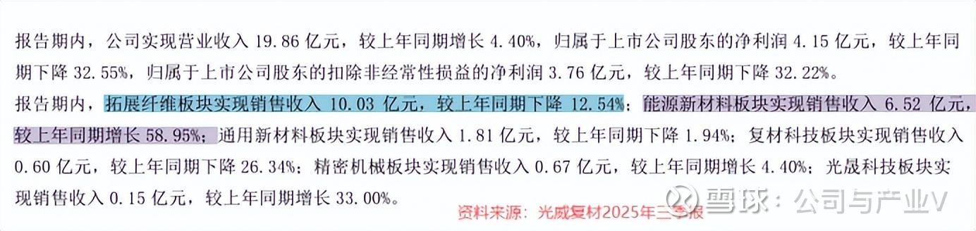 具体看,随着下游风电行业的需求复苏,光威复材主要做风电碳梁的新能源材料业务,2025年前三季度实现营收6.52亿元,同比猛增了58.95%!