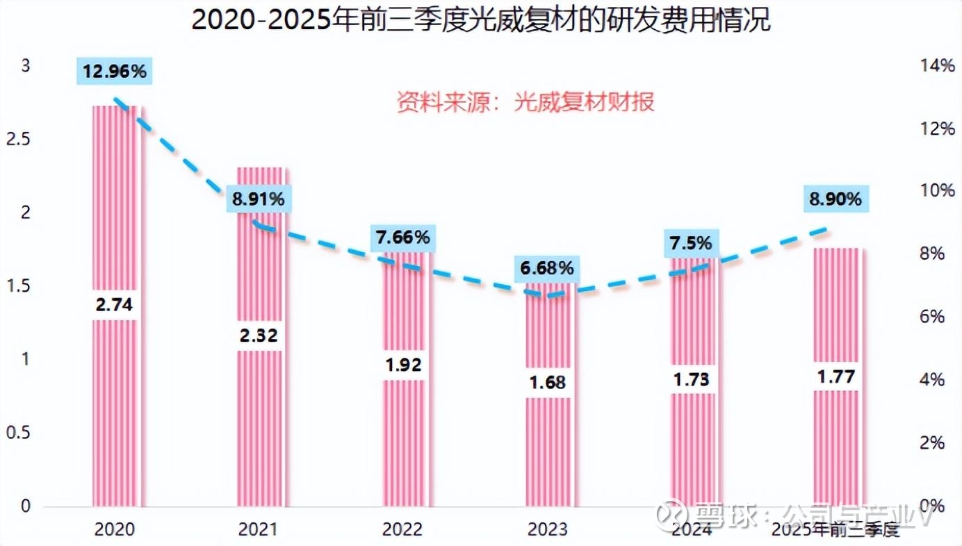 2025年前三季度,光威复材在研发方面的投入明显提速,其研发费用达到1.77亿元,同比猛增了86.32%,研发费用率也增至8.9%,高过中复神鹰、吉林化纤等同行。