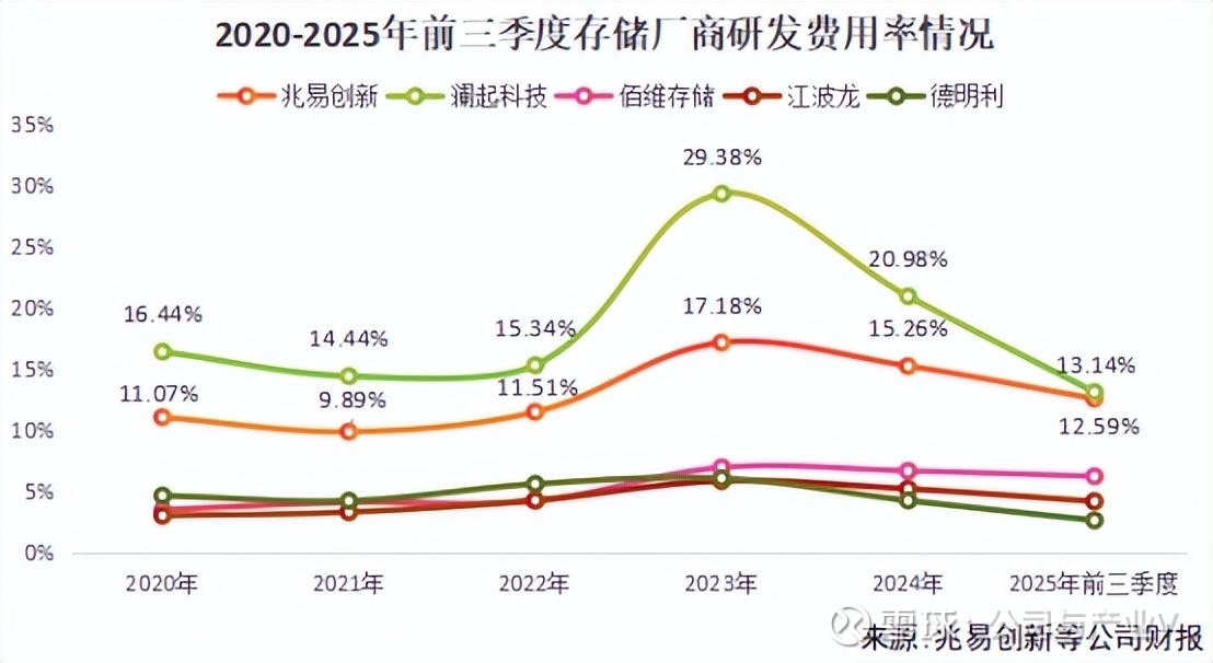 2020-2025年前三季度,兆易创新研发费用率也几乎在10%以上,与佰维存储、江波龙、德明利常年维持在7%以下的研发费用率形成鲜明对比。