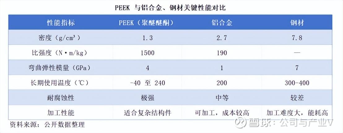 以PEEK(聚醚醚酮)为代表的特种工程塑料,密度仅1.3g/cm³,约为铝合金的1/2、钢材的1/6,而比强度高达1500N·m/kg,是铝合金的7.9倍,弯曲弹性模量更是铝合金的4倍。