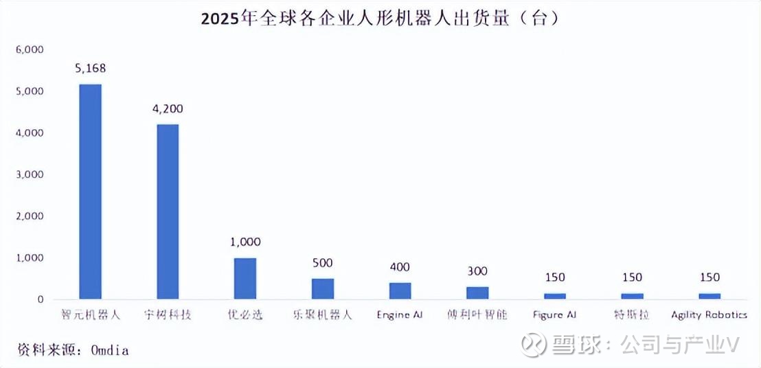 2025年是人形机器人打基础、蓄势待发的关键之年。据Omdia最新数据,2025年全球人形机器人出货量约1.3万台,智元机器人以39%市占率登顶,宇树科技紧随其后。