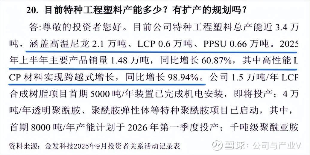 除此之外,其1.5万吨/年LCP合成树脂项目首期5000吨装置已完成机电安装即将投产,4万吨/年特种聚酰胺项目首期8000吨产能也在推进中。