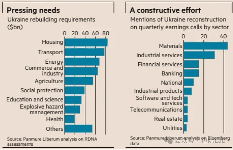,材料和工业服务等行业的公司对此关注度最高。目前,钢铁制造商安赛乐米塔尔(ArcelorMittal)、建筑材料公司金斯潘(Kingspan)及风电公司维斯塔斯(Vestas)等欧洲企业已在积极布局乌克兰市场。