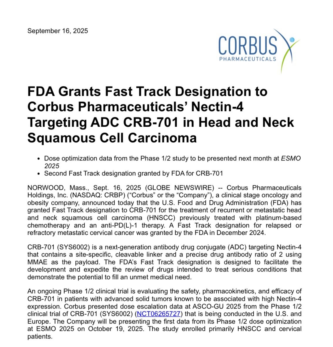 关于最新数据1/2期研究的剂量优化数据corbus将于下个月在ESMO 2025上展示。