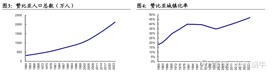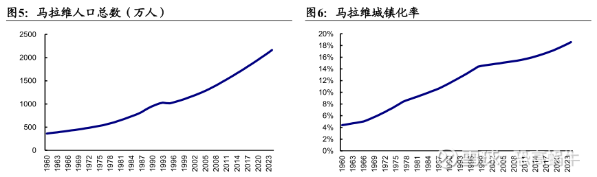 赞比亚位于非洲中南部内陆,与安哥拉、刚果(金)、坦桑尼亚、津巴布韦、马拉维等 8 个国家接壤,人口超过 2000 万人,人口密度低,城镇化水平2023 年不足 50%。马拉维人口也是超过 2000 万人,人口密度高;其城镇化水平2023 年尚不足 20%的水平。