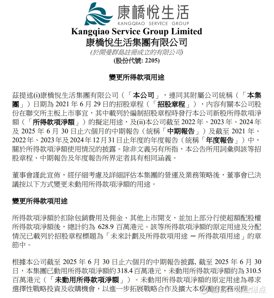 近日,港股上市物企康桥悦生活(02205.HK)一则募资用途变更公告,在行业内激起不小波澜。原本计划用于收并购的2.75亿港元资金,被全额转作营运资金。