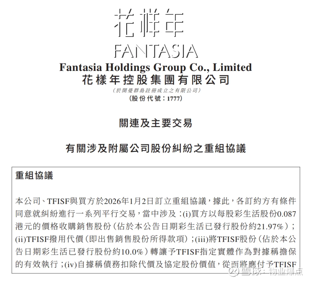 花样年控股(01777.HK)宣布与天风国际证券与期货有限公司(TFISF)、买方签署重组协议,涉及彩生活(01778.HK)超三成股份的流转。