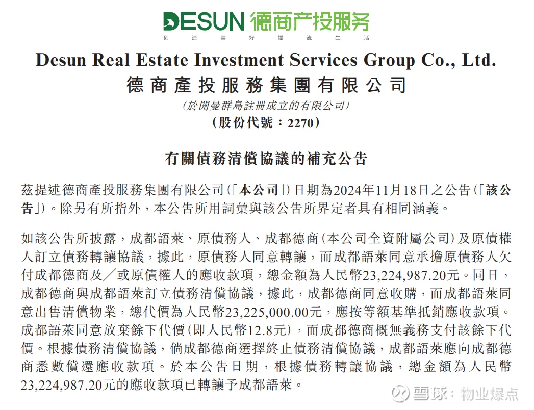 这种压力直接体现在债务处置上:12月公告显示,德商产投取消原计划的物业抵偿方案,要求合作方成都语莱在2025年底前以现金全额支付2322.49万元欠款。这种“弃资产取现金”的操作,直接反映出中小物业企业的资金周转压力。