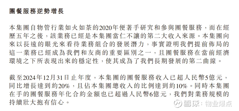 尽管2024年整体业绩承压,但业绩公告明确指出,公司核心业务仍保持正常运营,尤其是团餐服务表现亮眼,同比增长超20%,成为显著的收入来源。进入2025年,这一增长势头持续强化,成为公司摆脱地产关联依赖的核心引擎。