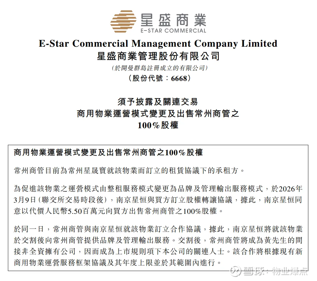 3月9日,港股商业运营服务上市公司“星盛商业”公告以550万元出售常州商管100%股权,同步将相关项目由整租转为品牌+管理输出模式。