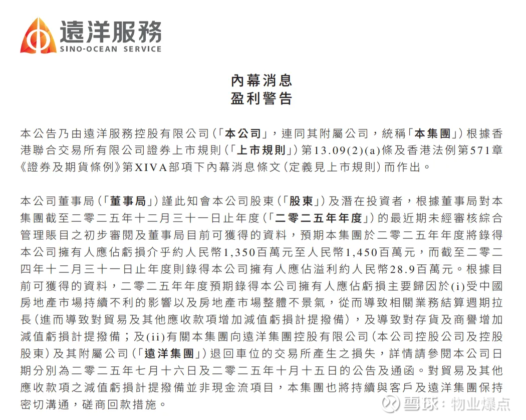 2026年3月18日,远洋服务(06677.HK)发布盈利预警,直接炸穿市场预期:2025年拥有人应占亏损预计约13.5亿—14.5亿元。