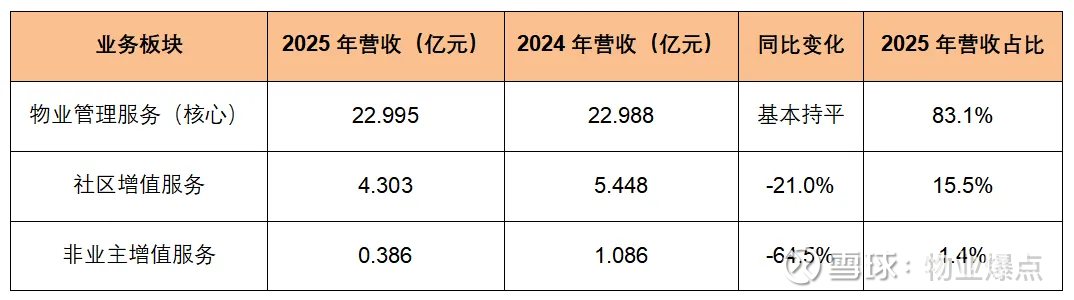 建业新生活的三大业务板块,2025年凉了两个,只剩基础物业管理服务硬撑,营收结构单一,抗风险能力弱。