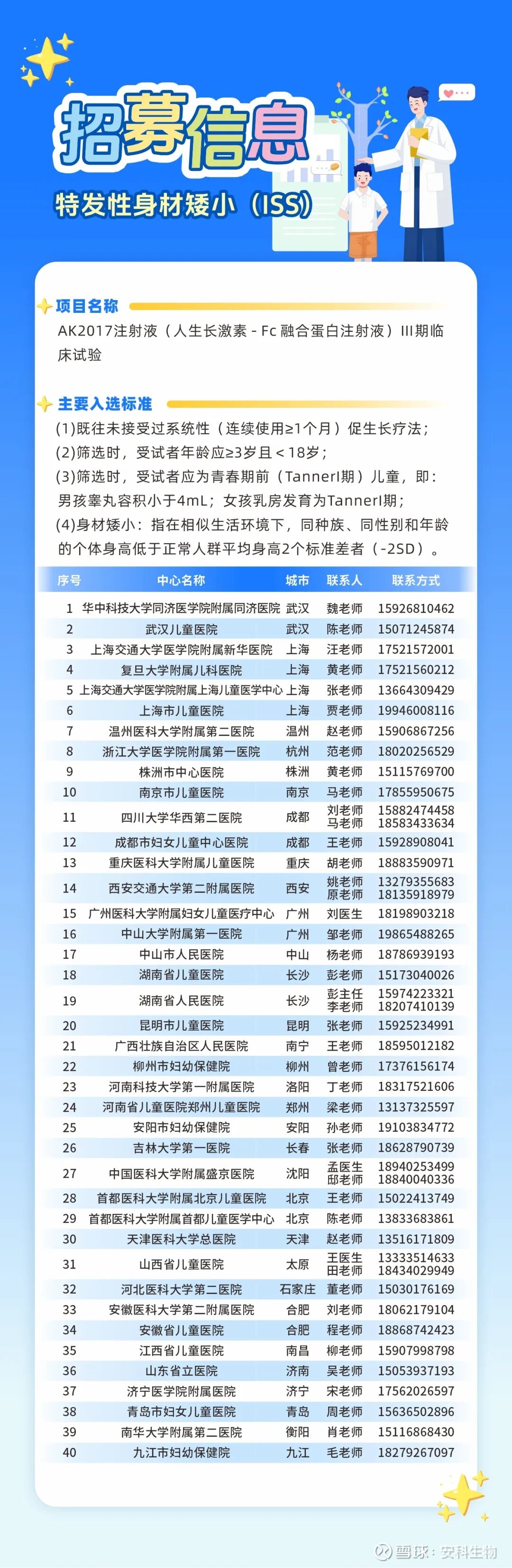 目前,该III期临床试验的全国多中心布局已全面展开:华中科技大学同济医学院附属同济医院、青岛市妇女儿童医院、江西省儿童医院、湖南省儿童医院、株洲市中心医院、河南省儿童医院、山东省立医院、河南科技大学第一附属医院已启动,其他中心陆续启动中,国内拟开展中心名单如下:
