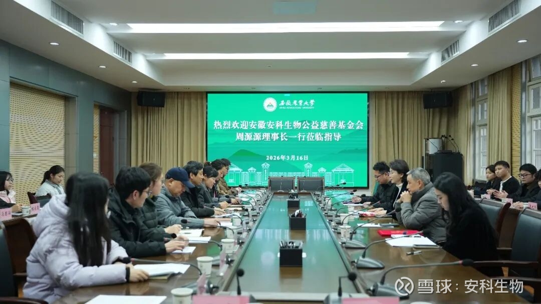 2026年3月16日,安徽安科生物公益慈善基金会与安徽农业大学教育基金会捐赠签约仪式在安徽农业大学举行。安徽安科生物工程(集团)股份有限公司副董事长、安科生物公益慈善基金会理事长周源源,安科生物党委书记汪灶标,安徽农业大学党委书记张庆亮,安徽农业大学教育基金会理事长裴树东等出席仪式,见证了这一传递温暖与关爱的公益善举。