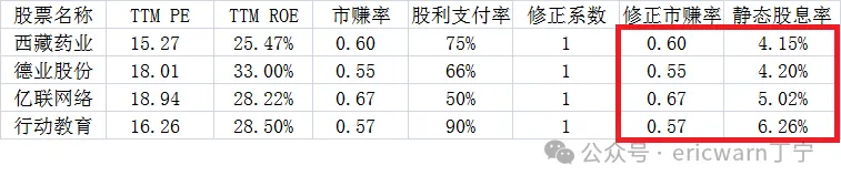 市赚率非常适用于ROE稳定且分红慷慨的价值股,但分红略抠的价值股却不太好用。针对分红略抠的股票,我又以50%股利支付率作为标杆,加入了修正系数N(PR=N*PE/ROE/100)。股利支付率≥50%的企业,修正系数为1.0(50%除以50%);股利支付率≤25%的企业,修正系数为2.0(50%除以25%);50%>股利支付率>25%的企业,例如30%的银行股,修正系数为1.67(50%除以30%)。如果需要贴近企业现状,则可采用TTM PE搭配TTM ROE进行估值。