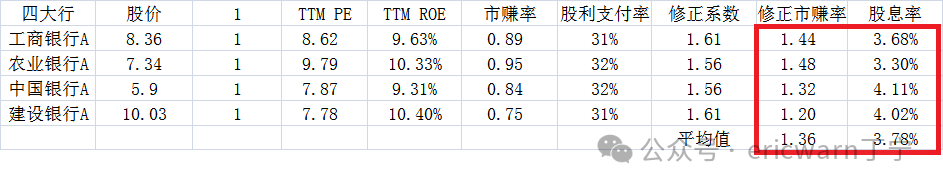 不得不说的是,市赚率与巴菲特一直念叨的DCF现金流折现在理论上其实是相通的。考虑到低利率环境下,折现率会降低,所以市赚率的合理估值也会从1PR上移至1.1~1.4PR之间。银行板块前期高点附近,我在四大行的A股平均估值涨到1.2PR时,股息率跌破4%之后,越涨越卖清仓了所有银行股。观察下表可以发现,四大行的最高平均估值并未涨到1.4PR,只涨到了1.36PR。最低股息率也只跌到了3.78%,甚至要比1.7%的十年期国债利率的两倍还更多。这就意味着,银行板块的下跌,就像智子那样锁死了价值股的上涨空间!任何所谓的“高息股”,股息率跌破4%之后,都应该越涨越卖了!最近我也抄底了几个高息股,除了业绩增长潜力巨大的,余下的都会在股息率跌破4%之后越涨越卖!