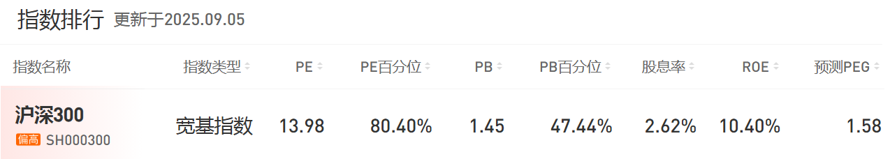 今日收盘,蛋卷基金(网页链接)提供的沪深300数据是:市盈率为13.98PE,ROE为10.40%,市赚率=13.98/10.40%/100=1.34PR。