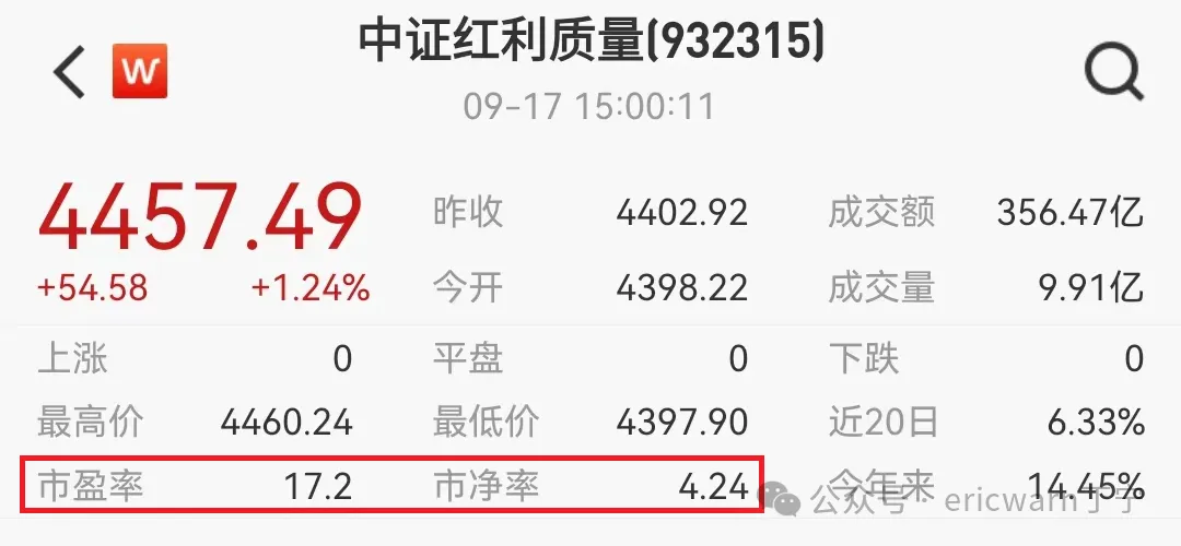 今日收盘,Wind金融终端显示,中证红利质量ETF(159209.SZ)的市盈率为17.2PE,ROE为24.65%(4.24PB除以17.2PE),市赚率=17.2/24.65%/100=0.70PR,也就是正好7折。考虑到现在是低利率环境,合理估值会上移至1.1~1.4PR之间。所以不仅不应减仓,甚至还可考虑加仓!