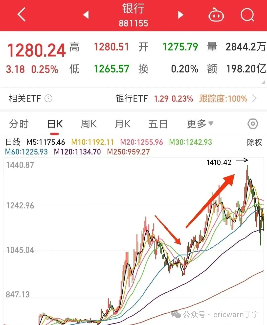 复盘2015年牛市,就会发现红利高息股也曾有过大幅调整,之后才迎来了第二波上涨。以最具高息特征的银行指数为例,2025年1月便开始回调,从高点的1189.54点回调至936.07点,回调幅度高达20%。之后才开启了第二波50%的大涨,并创出了1410.42点的多年新高。反观现在的银行指数,高点回调幅度则已达到了15%左右,距离极限位已经十分接近。