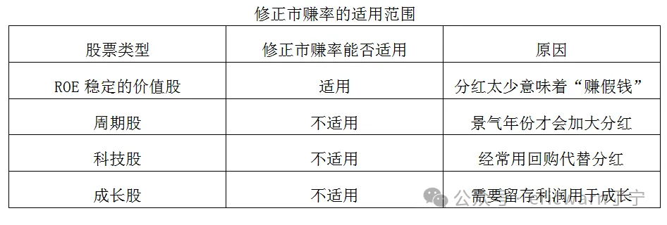 修正市赚率仅适用于ROE及分红稳定的价值股,周期股不适用(因为景气年份才会加大分红)、科技股不适用(因为经常用回购代替分红)、成长股不适用(因为需要留存利润用于成长)。