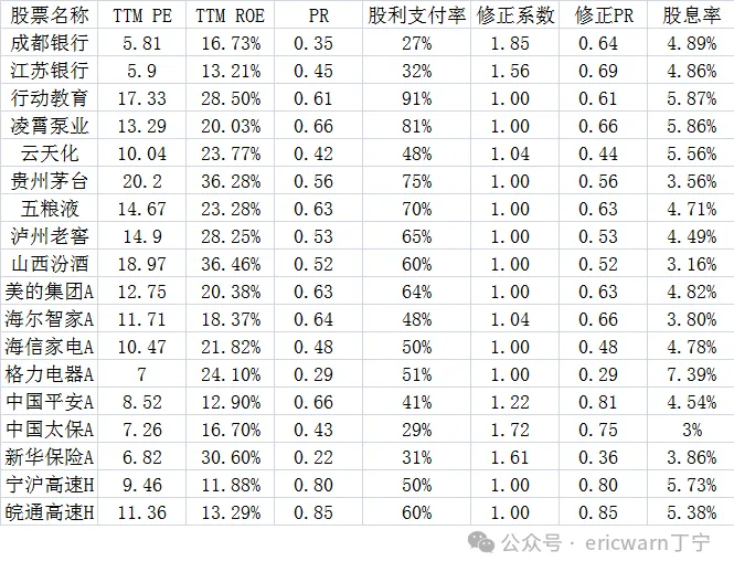 针对“赚假钱”的公司,我又以50%股利支付率作为标杆,加入了修正系数N(PR=N*PE/ROE/100)。股利支付率≥50%的企业,修正系数为1.0(50%除以50%);股利支付率≤25%的企业,修正系数为2.0(50%除以25%);50%>股利支付率>25%的企业,例如30%的银行股,修正系数为1.67(50%除以30%)。