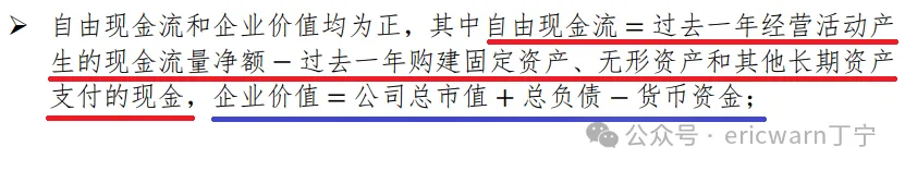 其中自由现金流=过去一年经营活动产生的现金流量净额-过去一年购建固定资产、无形资产和其他长期资产支付的现金。企业价值=公司总市值+总负债-货币资金。