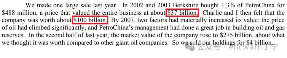 巴菲特股东信里写过,买入中国石油H股时,总市值仅为370亿美元。至于1PR市赚率所对应的企业内在价值,则可设定为未知数X。顺此脉络,列出一个方程式:0.38PR/1PR=370亿/X。经过简单计算,X等于974亿美元。四舍五入之后(英文单词about),刚好就是巴菲特在股东信里所宣称的1000亿美元内在价值。