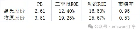 列举两个龙头企业,温氏股份和牧原股份,今年的动态ROE分别为16.53%和25.67%,市赚率分别为0.95PR和0.53PR。