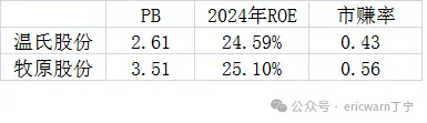 列举两个龙头企业,温氏股份和牧原股份,去年的ROE分别为24.59%和25.10%,市赚率分别为0.43PR和0.56PR。