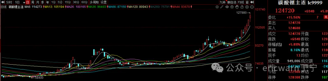 需要特别说明的是,我个人认为,本轮锂矿产业的景气周期并不会像上一轮那样波澜壮阔。所以说,碳酸锂期货的目标价,只是底部翻倍而已。本周大涨之后,目标价已到,所以近期就会获利了结碳酸锂期货。