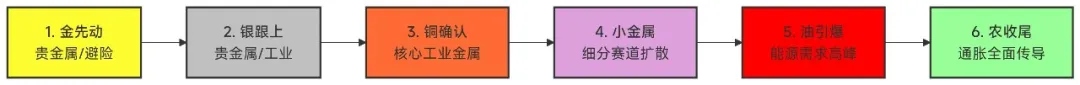 新年伊始,航空板块和金属板块出现了大幅上涨。比如说航空航天ETF(SZ:159227),就是近期领涨的典型代表。反观金属板块,则是百花齐放的状态。说到这里,就不得不提及一下前阵子在网上看到的一张资源牛市传导图。刚开始还不太相信,但最近复盘,竟发现大差不差。图中显示:第一阶段金先动(避险贵金属),第二阶段银跟上(工业贵金属),第三阶段铜确认(核心工业金属),第四阶段小金属(细分赛道扩展),第五阶段油引爆(能源需求高峰),第六阶段农收尾(通胀全面传导)。