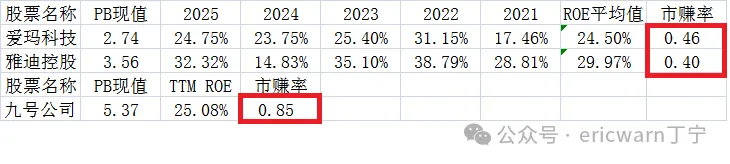与上述两家不同,九号公司是一家ROE快速提升的成长股。即便只考虑最新最高的TTM ROE数据(25.08%),九号公司的市赚率仍然高达0.85PR,只算是略微低估。由此可见,市赚率没法准确估值成长股。此种情况下,我的策略是只看行业龙头。行业龙头明显低估时,同行业的成长股大概率值得买入。反之,同行业的成长股大概率需要卖出!