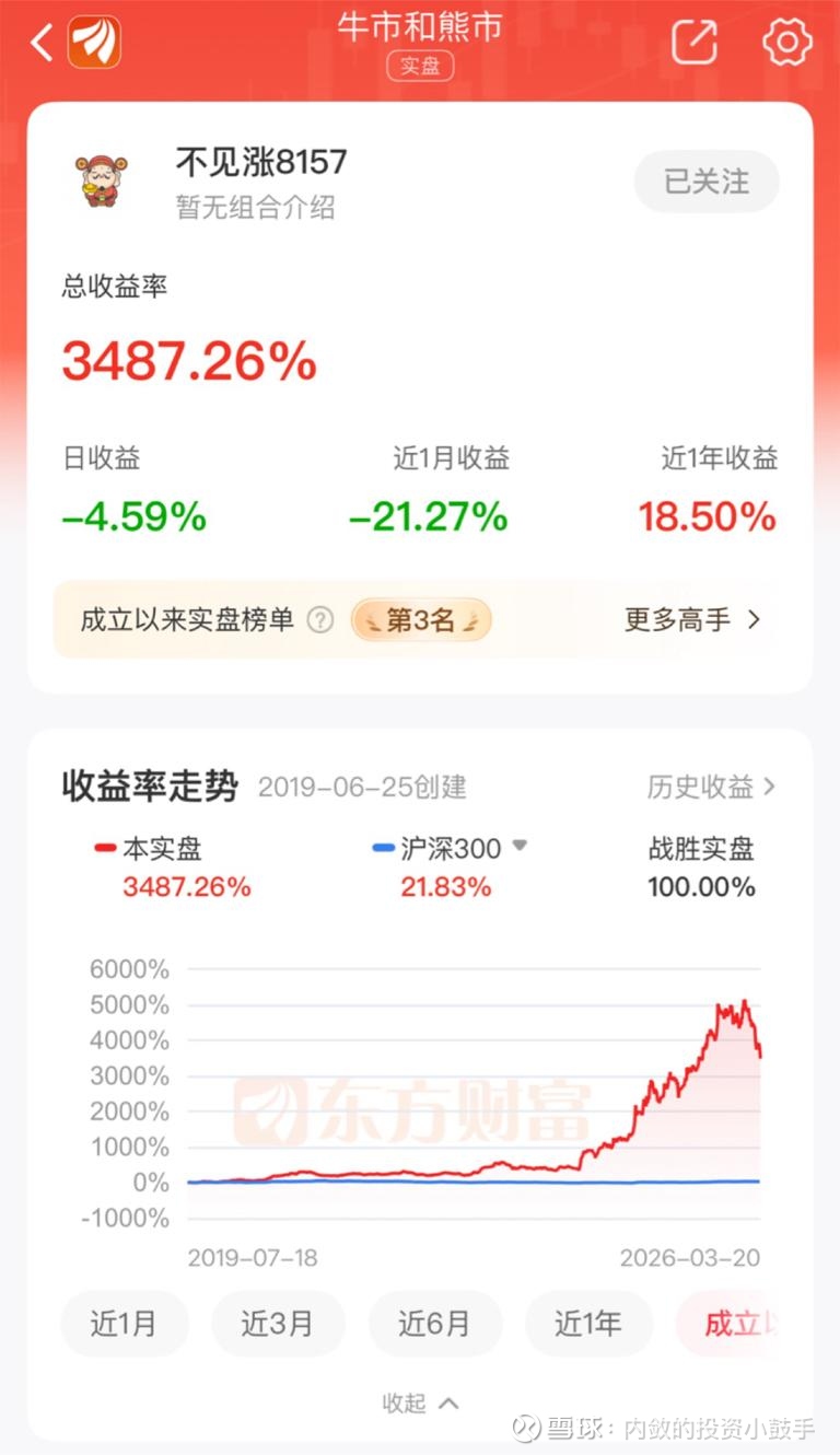 在东方财富实盘榜单中,**“不见涨8157”是一个极具标志性的存在。从2019年至今,他凭借3487.26%**的累计收益位列前茅。